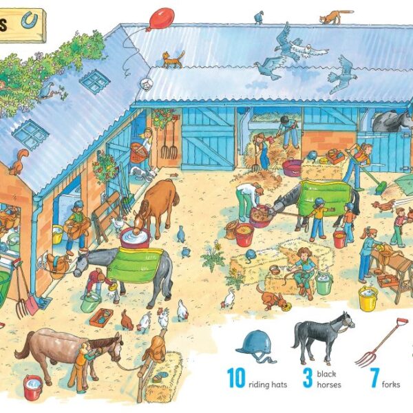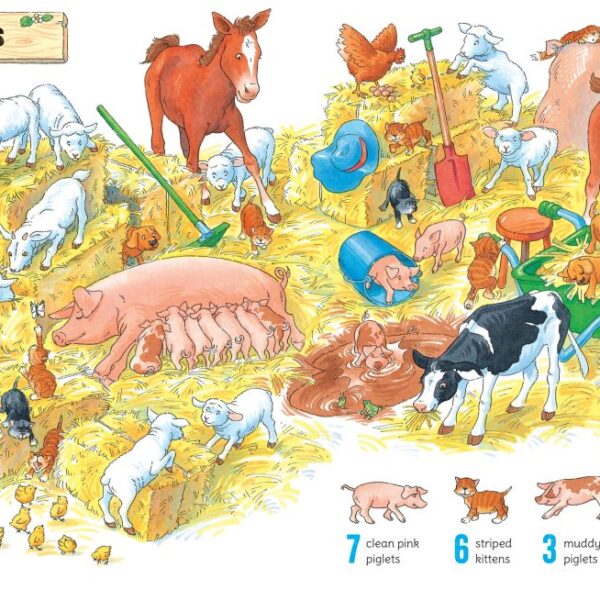 Aceasta carte de puzzle plina de activitati ofera ore intregi de distractie fara ecrane pentru copiii mici, in timp ce cauta tot felul de lucruri pe diferite tipuri de ferme. De la mulgerea vacilor la o ferma de lapte, la ziua de tundere a oilor, si albine pe o ferma de miere, pana la culesul fructelor intr-un livad, aceste scene pline de viata ii duc pe cititori in toate tipurile de medii agricole. Iconitele numerotate de pe fiecare pagina arata ce trebuie gasit in scena si cate trebuie numarate. In timp ce sunt ocupati sa studieze scenele bogat ilustrate, copiii vor dezvolta abilitati esentiale in gasirea, potrivirea, numararea, citirea si sortarea. Nu numai atat, dar copiii isi vor dezvolta si vocabularul si intelegerea fermelor. Perfecta pentru atat pentru cei care nu stiu sa citeasca, cat si pentru cititori, aceasta carte de puzzle este ideala pentru a-i tine ocupati pe copii in vacanta sau in orice alt moment!