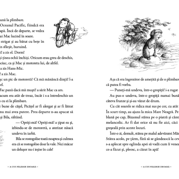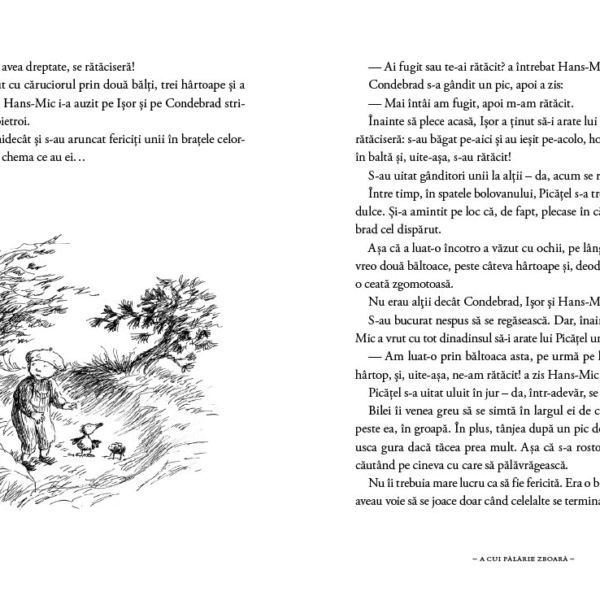 Drumul spre Tara lui Hans-Mic nu e lung. Iesi din casa, o apuci pe poteca pietruita, impingi poarta napadita de iedera, apoi iute prin deschizatura din tufa de liliac si gata, ai ajuns! Inca de pe poteca se aud vocea trista a Bizamului si bufniturile Bilei in iarba. Ziua, conutele fac zarva, iar in buzunarul lui Hans-Mic, mititelul Isor canta. Noaptea, luna aluneca lin pe cer, stelele se aprind si se sting, iar intunericul se umple de piuit si chitait. Dar toate sunt la locul lor pe lumina: marea, pajistile, groapa cu nisip si padurea. Si, printre toate cate sunt, curge Raul, atat de frumos si nestavilit…