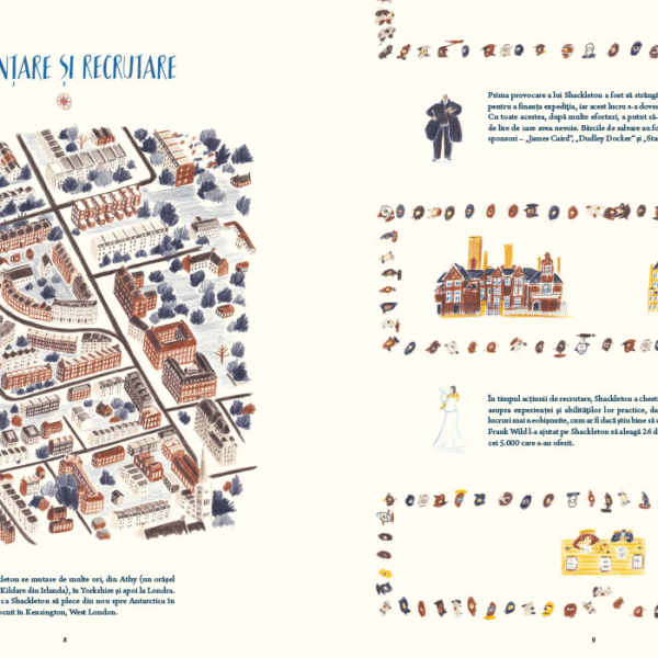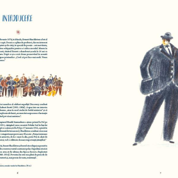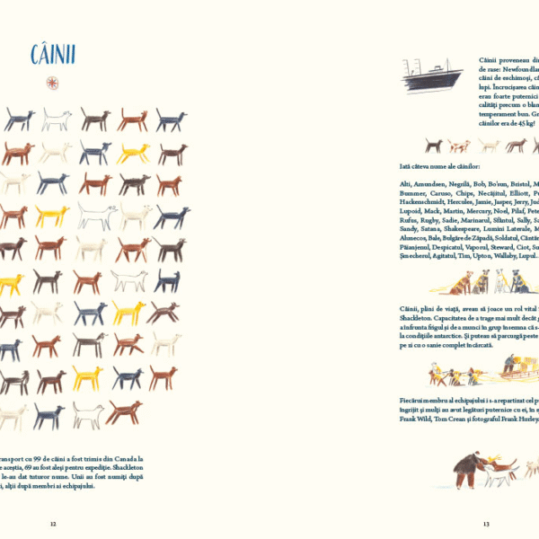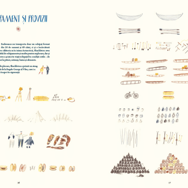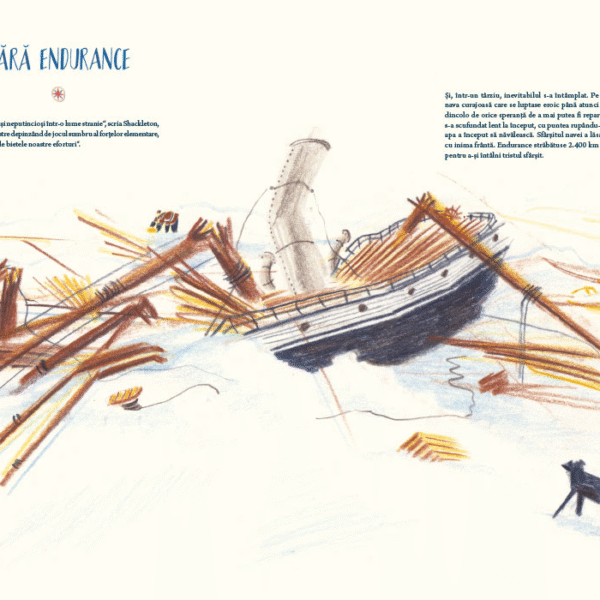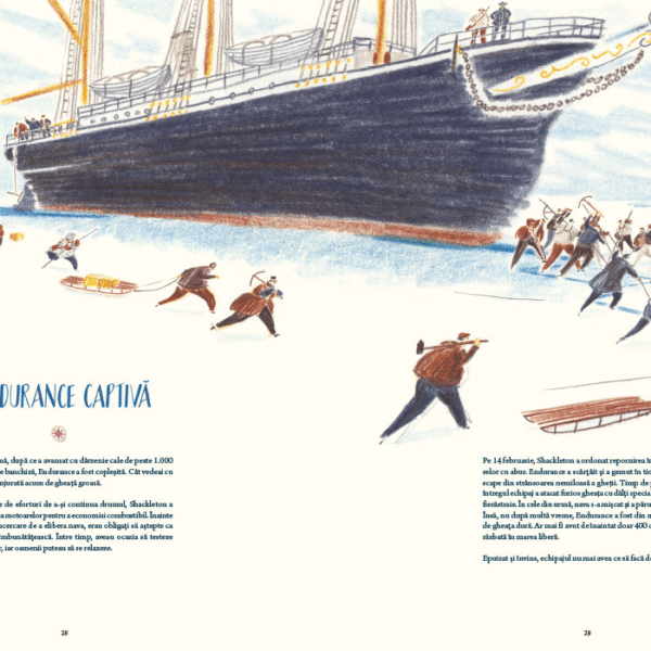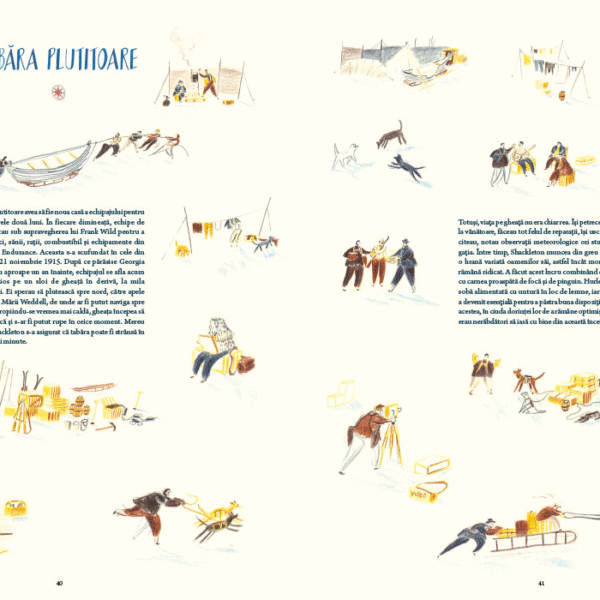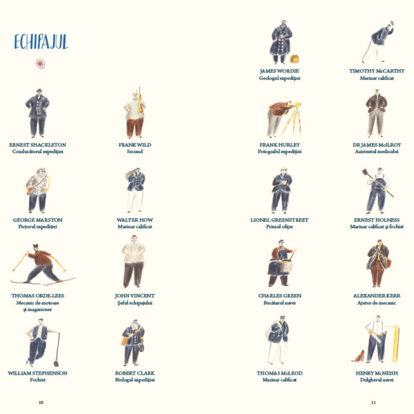 William Grill, autorul, a avut inspiratia sa ne vorbeasca despre expeditia lui Shackleton nu numai prin datele ei principale – cine, ce, unde, cand – ci mai ales prin micile detalii ale vietii de zi cu zi. Ne prezinta membrii echipajului, fiecare cu numele complet si postul sau, insotite de un desen, vedem pregatirile pentru drum, proviziile, constructia navei. Autorul nu uita de cei 69 de caini care au participat la expeditie – are rabdare sa-i deseneze pe toti si sa le insire numele. In lungile luni de izolare petrecute pe banchiza, dupa scufundarea navei, vedem ce fac oamenii, ce mananca, ce citesc, cum se distreaza, cum sarbatoresc.