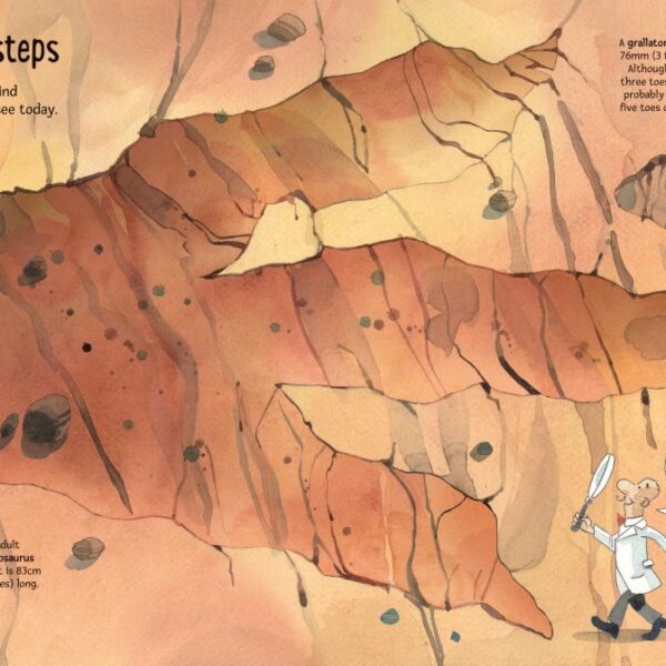 Atentie la amprenta de T. rex (tanar) la dimensiune reala – suficient de mare pentru ca micii cititori sa-si incadreze propriul picior inauntru!