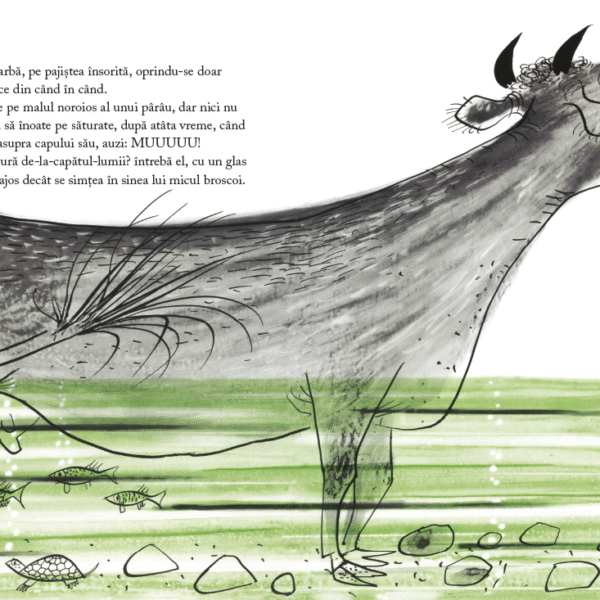 Dar atunci cand, din cine stie ce pricina, fantana seaca si gazele nu mai vin atrase de licarirea apei, broscoiul nu are incotro si trebuie sa paraseasca fantana care l-a adapostit. Oare ce se afla dincolo de „capatul lumii“? Calatoria micului broscoi il va purta nu numai spre descoperirea unei lumi mult mai vaste decat putea sa-si imagineze, ci si spre intanirea cu alte fiinte: o vaca, o pasare, animalele padurii – fiecare cu parerea lui despre ce este „lumea“ si unde se termina. Cine are dreptate?