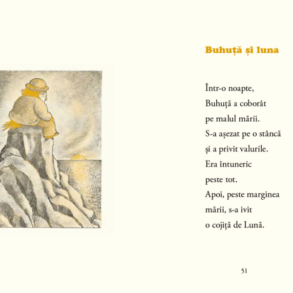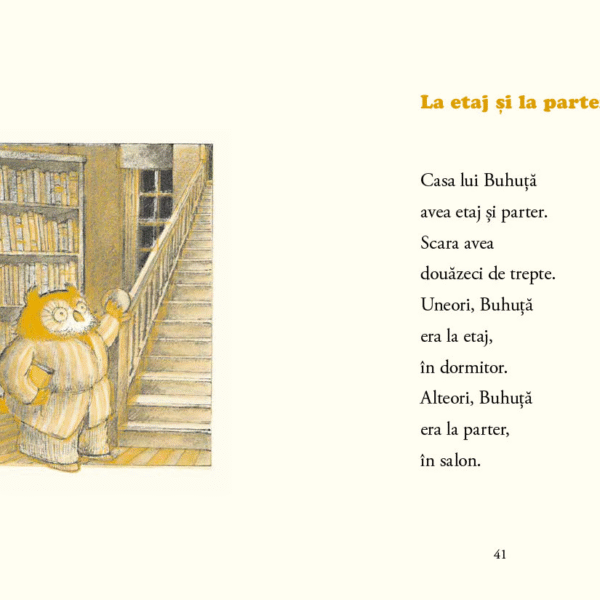 Buhuta nu este foarte aventuros. Ii place sa stea mai mult la el acasa, ca oricarei bufnite. E cumsecade si prietenos, iar intamplarile amuzante prin care trece in cele cinci povestiri din aceasta carte nu sunt decat ipostaze ale copilariei, cu naturaletea si disponibilitatea ei fara retinere de a pune orice intrebare.