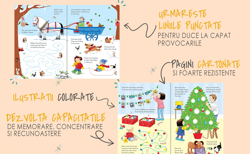 Aceasta carte plina de distractie ofera o multime de activitati tematice de Craciun, toate proiectate sa stimuleze creativitatea si imaginatia copiilor, in timp ce le permite sa practice si sa isi dezvolte abilitatile.