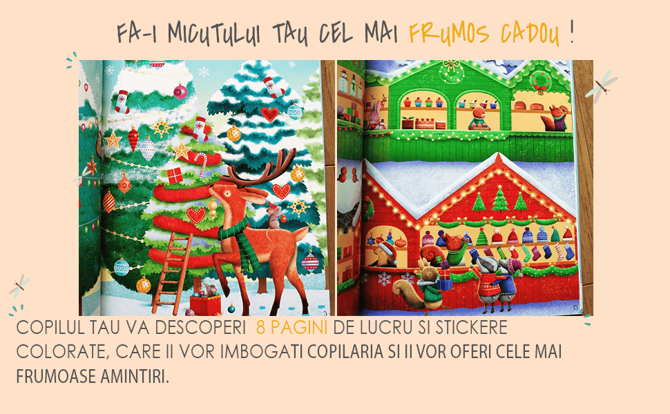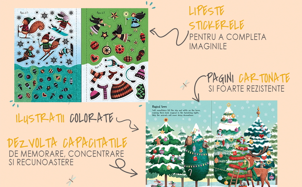 Copiii vor fi incantati sa exploreze paginile pline de personaje festive, ornamente de brad, cadouri stralucitoare si peisaje de iarna. Autocolantele sclipitoare aduc un plus de magie, transformand fiecare activitate intr-un moment special.
