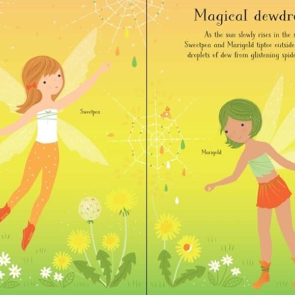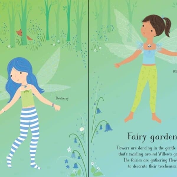 Aceasta carte de activitati include o multitudine de autocolante cu care copiii pot imbraca personajele. Fiecare scena ilustreaza o poveste diferita din viata zanelor padurii, iar copiii sunt invitati sa foloseasca autocolantele pentru a completa fiecare imagine.