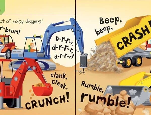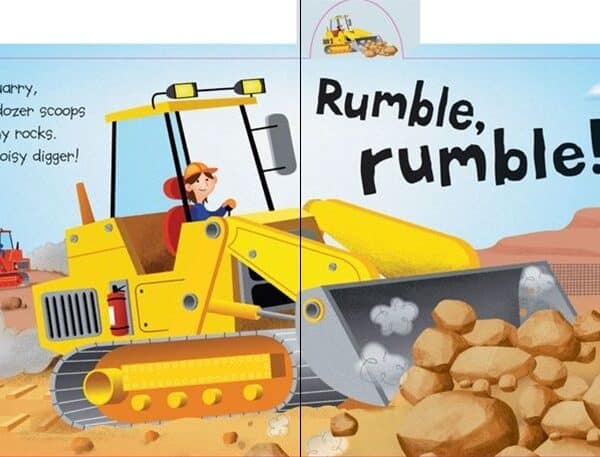 Imagini diverse, care infatiseaza un buldozer zgomotos, un spargator de roci, un excavator care sapa o gaura si o basculanta care descarca roci, precum si alte utilaje perfecte pentru micutii constructori.