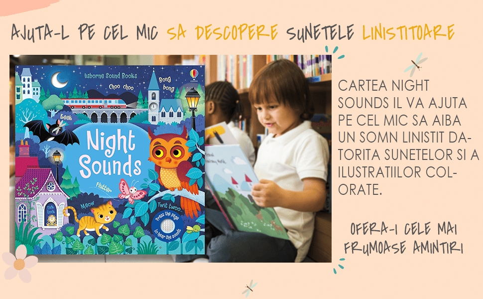 “Night Sounds” este o carte care ofera o experienta auditiva imersiva, permitand copiilor sa auda diferite sunete din natura care apar noaptea. De la sunetele nocturne ale padurii, pana la cele ale orasului sau ale oceanului, fiecare pagina are un buton pe care copiii il pot apasa pentru a auzi sunetele specifice scenariului reprezentat. Ilustratiile colorate si detaliile informative fac din aceasta carte o resursa educativa si distractiva.