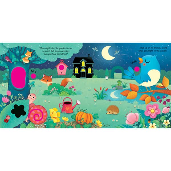 “Garden Sounds” este o carte cu sunete care reproduce diferite zgomote pe care le-am putea auzi intr-o gradina. Fiecare pagina contine un buton care, odata apasat, va reproduce sunetul specific unei scene din gradina, cum ar fi zumzetul albinelor sau cantoarea pasarilor. Ilustratiile colorate si atractive stimuleaza si mai mult interesul copiilor pentru natura, oferind o experienta de invatare holistica.