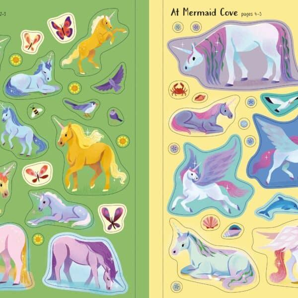 First Sticker Book Unicornseste mai mult decat o simpla carte, este o calatorie in regatul unde totul este posibil, unde copiii pot zbura pe spatele unicornilor printr-un cer de curcubeie si stele sclipitoare, descoperind noi teritorii pline de culoare si lumina.
