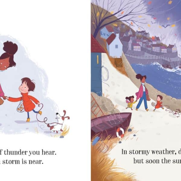 Furtunile pot fi infricosatoare, mai ales pentru copiii mici. Printr-un text ritmat, aceasta poveste reconfortanta despre o zi furtunoasa la mare le spune copiilor tot ce se intampla intr-o furtuna. Vantul este zgomotos, norii sunt mari si negri, iar acel zgomot surd din cer este tunetul. Fulgerul straluceste, tunetul bubuie si, daca numeri, poti spune daca furtuna se apropie sau se indeparteaza. Dar nu este nimic de ingrijorat – toate furtunile trec. Dupa furtuna vine din nou calmul – si multe lucruri interesante de gasit pe plaja.