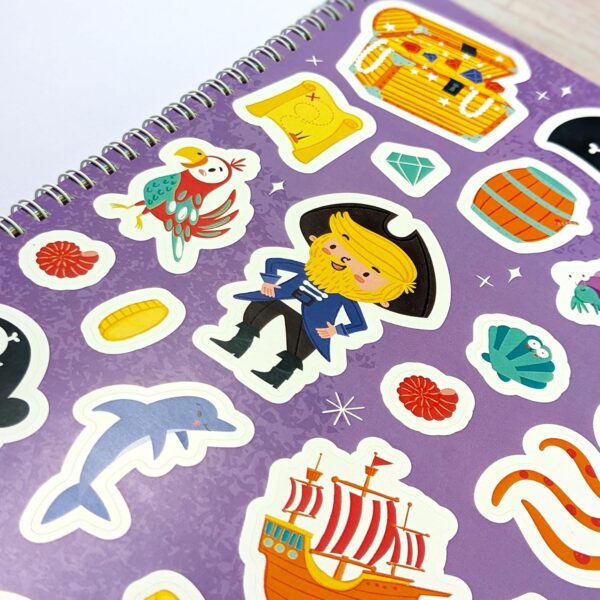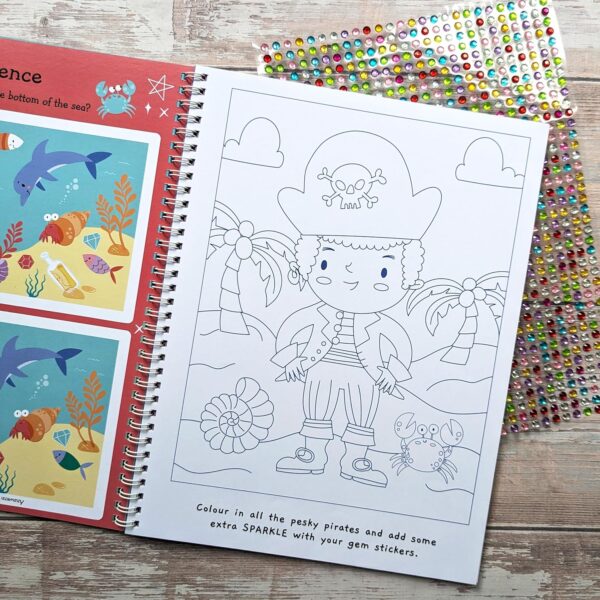 Piratii aia enervanti nu planuiesc nimic bun! Porniti intr-o aventura uimitoare cu aceasta carte de activitati cu pirati plina de actiune – care include peste 1000 de pietre pretioase, raspandiri de colorat si o multime de activitati de finalizat. Copiii se vor bucura de ore intregi de distractie cu aceasta carte de activitati distractive. Cartea include 1000 de pietre pretioase, autocolante distractive si jocuri si puzzle-uri. Exista activitati de colorat, jocuri de numarare si cautari de cuvinte, impreuna cu jocuri de practica de control al stiloului. Aceasta carte de activitati Gem Art Sticker este perfecta pentru calatorii, zile ploioase sau timp linistit acasa.