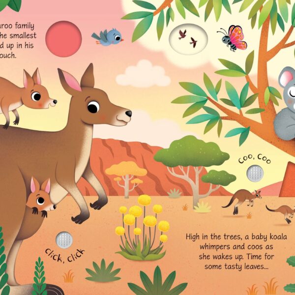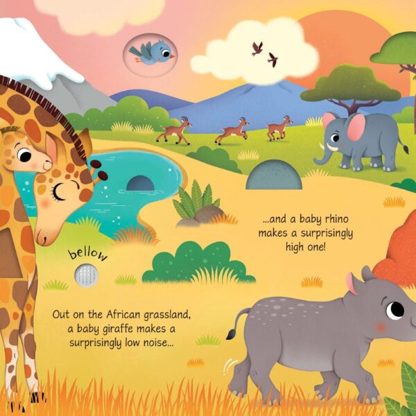 Descriere: De la puii de pinguin si puii de foca pana la puii de tigru si puii de rinocer, in aceasta carte fermecatoare sunt tot felul de animale mici care fac sunete dragalase. Cu zece butoane pe pagini de apasat, exista o vizita in Australia pentru a auzi ce zgomote fac puii de cangur si koala, precum si o calatorie in jungla pentru a asculta un pui de maimuta si o ferma unde prind viata un pui de alpaca si un magarus.
