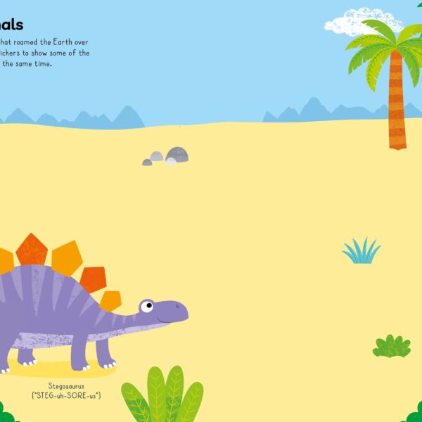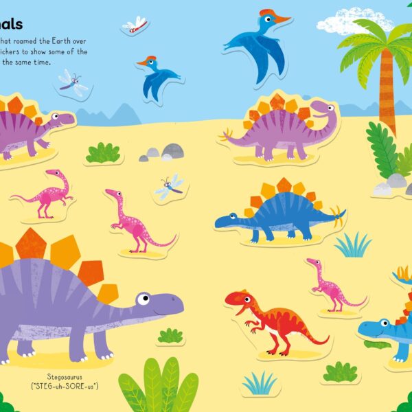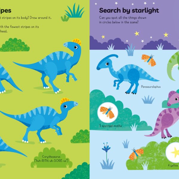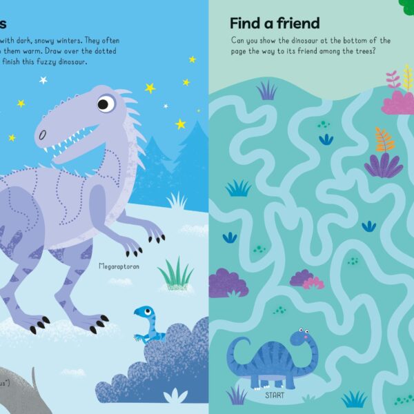 Aceasta carte ilustrata este plina de dinozauri de numarat si potrivit, diferente de observat, labirinturi de rezolvat si dinozauri punct la punct de terminat. Exista, de asemenea, desene de colorat, fapte despre dinozauri si scene de completat cu autocolantele furnizate. Opt foi de activitati de presare includ modele de dinozauri si papusi cu degete de facut, un puzzle cu doua fete si doua jocuri de domino.