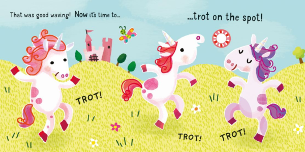 Pe fiecare pagina este prezentat un grup diferit de unicorni dansatori, cu o melodie vesela pe care copiii pot dansa.