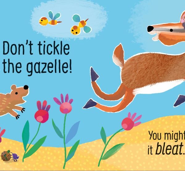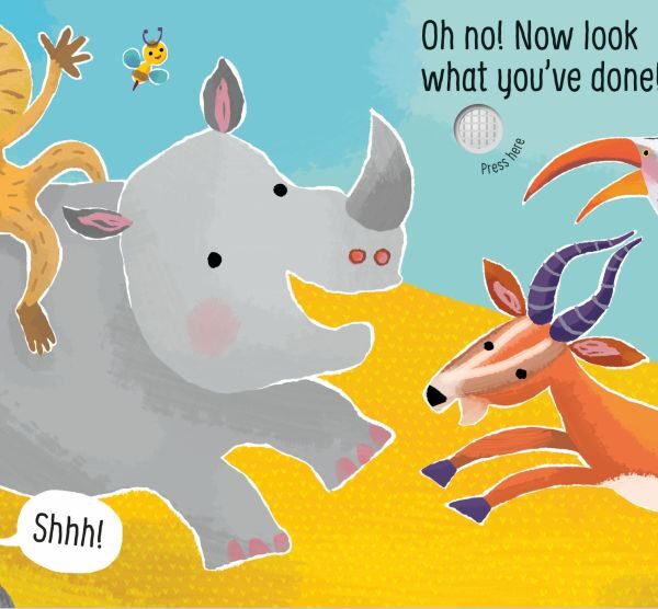 Mai bine nu gadila rinocerul… pentru ca s-ar putea sa pufneasca daca o faci! Bebelusii si copiii mici vor adora sa exploreze lumea hilara a acestei carti, unde fiecare animal poate fi adus la viata prin atingerea unei zone moi de pe pagina. Pe langa un rinocer de gadilat, mai exista un babuin, o gazela si un hornbill, iar pe ultima pagina este un final muzical cu toate animalele facand zgomot in acelasi timp!