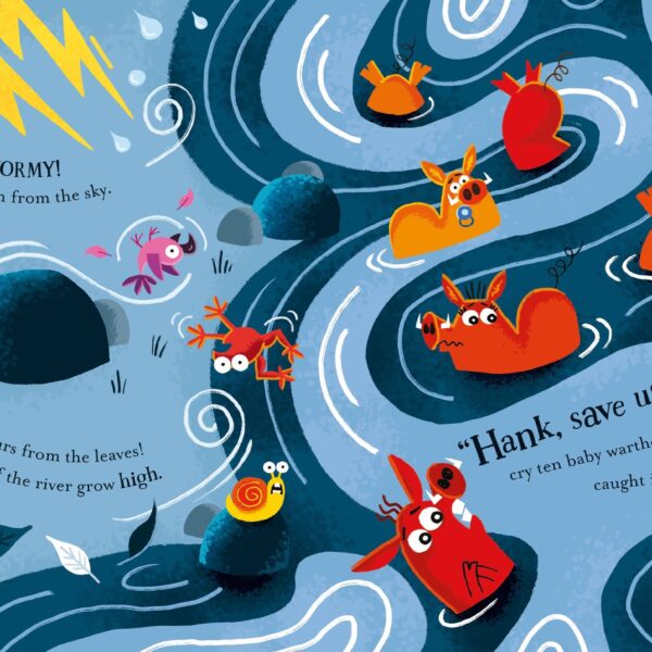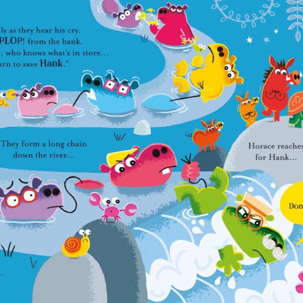 O prima carte ilustrata geniala pentru a incuraja bunatatea si empatia. Hank hipopotamul iubeste sa ajute, dar toti ceilalti hipopotami cred ca este un prost. Mai ales Horace: “Hipopotamii nu sunt de ajutor! Nu este ceea ce facem. Ne petrecem timpul in piscine!” Dar cand vine un mare potop, Hank este maturat in timp ce incearca sa ajute celelalte animale. Ce va face Horace atunci? Aceasta poveste emotionanta, spusa in versuri fara efort, este plina de ilustratii calde si spirituale si hipopotami irezistibili!