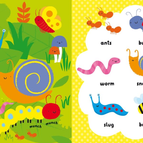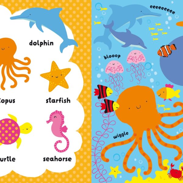 Aceasta carte captivanta este plina de imagini indraznete cu animale la o ferma, intr-o jungla, sub mare, intr-o gradina si in padure. Exista nume si sunete de animale de invatat pe fiecare pagina, de la caprioare la delfini, omizi la crocodili si broaste testoase la tigri.