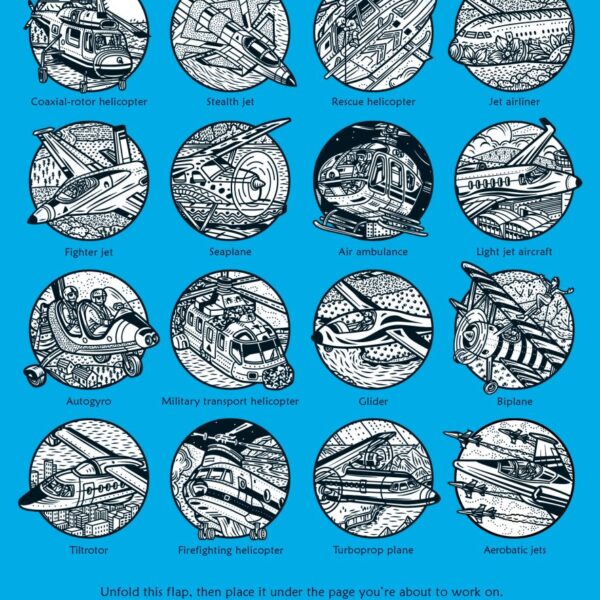 Plina de scene dinamice cu avioane si elicoptere de toate formele, stilurile si dimensiunile, de la hidroavioane si tiltrotors pana la elicoptere de salvare, avioane de marfa si avioane de pasageri. Folositi pensula furnizata pentru a trece apa peste desene si culorile vibrante apar magic! O modalitate fara mizerie de a tine copiii ocupati, perfecta pentru calatorii. Pur si simplu introduceti clapeta impermeabila sub fiecare pagina pe masura ce este pictata, pentru a opri apa sa se infiltreze in restul cartii.