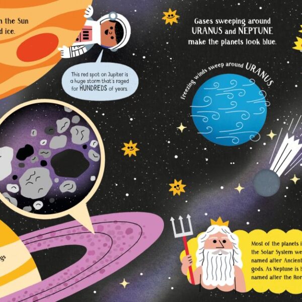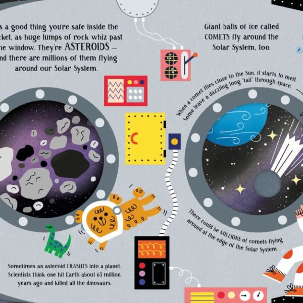 Plecati intr-o calatorie adanc in incredibilul nostru sistem solar. Intoarce paginile, arunca o privire prin gauri si ridica clapele pentru a descoperi secretele planetelor, lunilor si Soarelui. Vizitati planeta stancoasa Marte, zburati printr-o centura de asteroizi, vedeti o furtuna care razvrateste pe Jupiter si descoperiti ce se afla dincolo de uimitorul nostru sistem solar.
