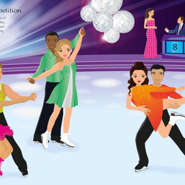 Imbraca papusile in timp ce isi indeplinesc visurile pe gheata! Aceasta carte include tinute pentru o sesiune de antrenament, costume pentru o competitie si un balet spectaculos pe gheata. Adauga patinele si multe accesorii stralucitoare!