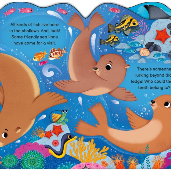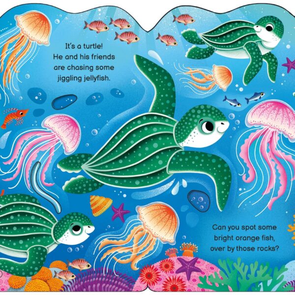 Faceti cunostinta cu broaste testoase, rechini, delfini si multe altele in timp ce explorati oceanul. Fiecare pagina robusta are o forma unica, excelenta pentru mainile mici si curioase. Stratificarea paginilor ofera un indiciu despre ceea ce urmeaza, mentinand cititorii foarte tineri implicati in timp ce ghicesc ce animale ar putea vedea cand intorc fiecare pagina.