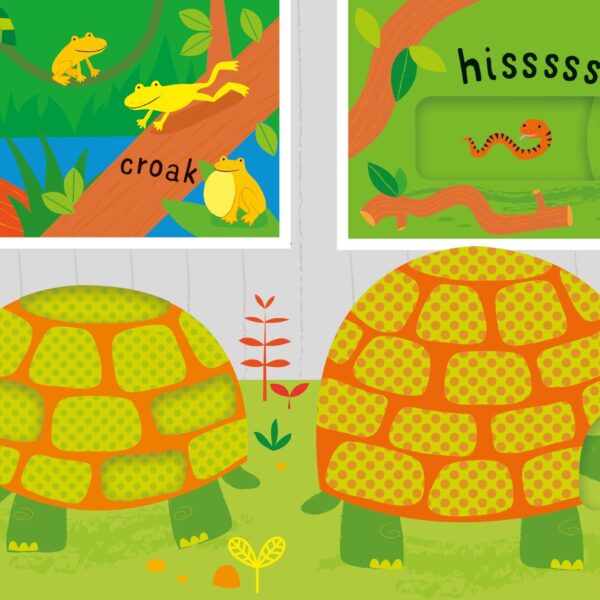 Descriere: Bebelușii vor adora să se uite la imaginile strălucitoare ale animalelor de la zoo și să vadă ce se întâmplă atunci când mișcă panourile glisante. Un elefant își salută trompa, o broască țestoasă iese și intră în carapace, iar un urangutan se leagănă în copaci. Există și forme decupate și trasee pentru degete de descoperit.