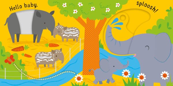 Descriere: Bebelușii vor adora să se uite la imaginile strălucitoare ale animalelor de la zoo și să vadă ce se întâmplă atunci când mișcă panourile glisante. Un elefant își salută trompa, o broască țestoasă iese și intră în carapace, iar un urangutan se leagănă în copaci. Există și forme decupate și trasee pentru degete de descoperit.