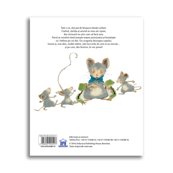 Descoperiti povestea emotionanta a doi pui de broasca care raman orfani. Corbul, cârtița si ariciul incearca sa-i ajute, dar nu stiu cum. Totul se schimba cand mama șoricioaică apare si decide sa-i infige pe cei doi. O lectie despre dragoste si familie, perfecta pentru micutii care invata despre empatie si ingrijire.