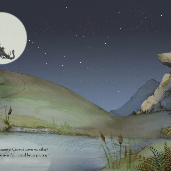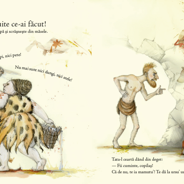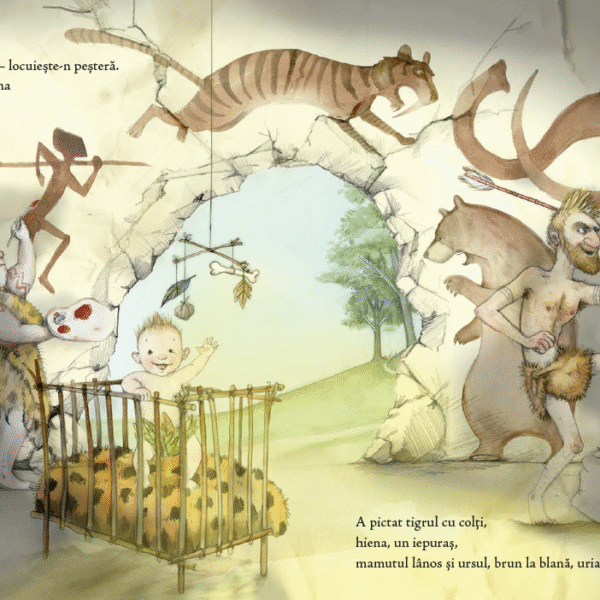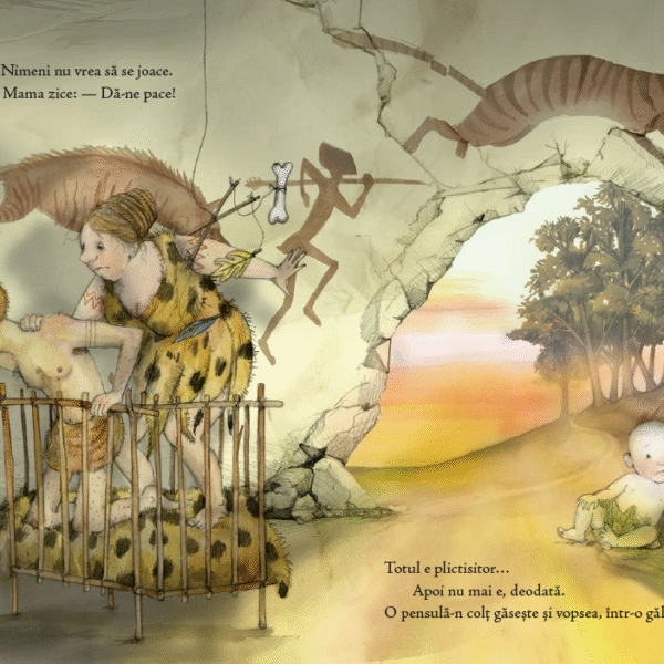 Dar de ce sa deseneze tigrul, iepurele, hiena sau mamutul asa cum ii face toata lumea? N-ar fi mai frumos sa fie tigrul roz, iepurele albastru, mamutul galben cu rosu si printre ele o multime de pete, buline si dungi de toate culorile? Acum da, pestera arata in sfarsit bine, chiar daca mama si tata nu sunt prea incantati. Ba chiar il cearta pe Pui-de-Om (nu se inventasera nici cartile de parenting): daca nu e cuminte, vine mamutul si-l duce la ursul urias! Iar noaptea, mamutul chiar vine si-l poarta pe Pui-de-Om intr-o mica aventura prin padure. A fost realitate, a fost vis?