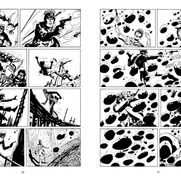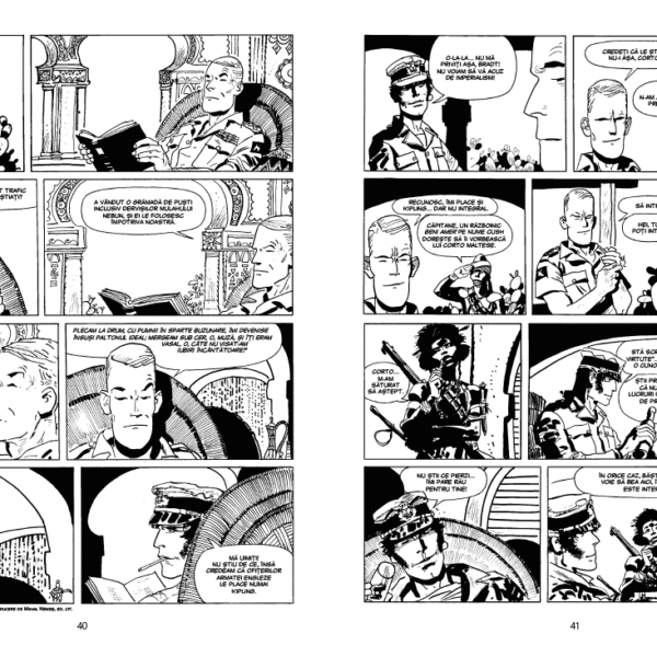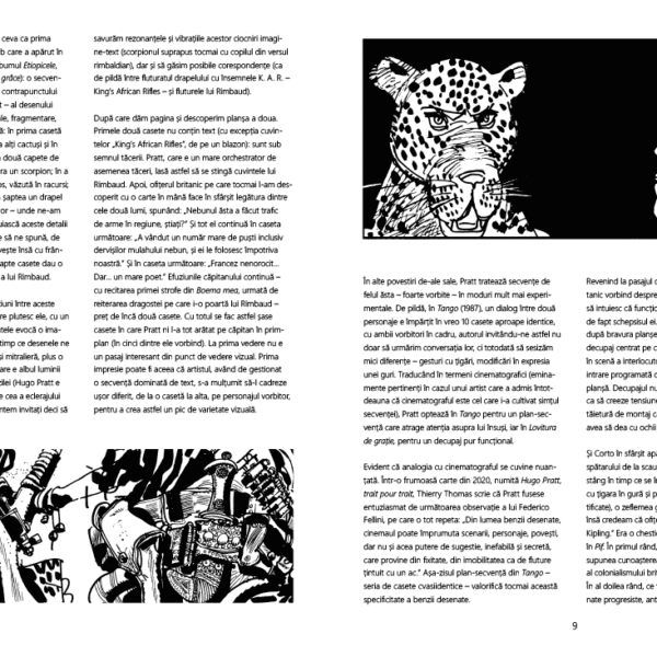 […] In Etiopicele se regasesc doua dintre cele mai faimoase experimente prattiene in directia unei dialectici intre figurativ si abstract. Unul se gaseste in secventa avalansei de pietre din … Despre alti Romeo si alte Juliete, unde pietrele care-l ataca pe Corto in fiecare caseta se aduna, la nivelul intregii pagini, intr-un model abstract – „o avalansa de cerneala”, cum a numit-o Matt Seneca. E un moment crucial din povestire, dar la conflictul dramatic se adauga si acest conflict intre continutul figurativ si puterea designului pur (caseta a sasea consfintind triumful acestuia din urma). La fel de faimoasa e si prima plansa din Leoparzi: un model abstract cu dungi se transforma de la o caseta la alta, printr-un fel de zoom inapoi (sau poate un travelling), in imaginea a doua zebre, imagine care apoi se complica prin intrarea in cadru a unor scuturi (purtate de trei razboinici) pictate cu dungi ca de zebra. Asemenea jocuri nu sunt izolate in arta lui Pratt, pentru care, in cuvintele lui Thomas, „deserturile, paltoanele, deflagratiile, zidurile de caramida sau date cu var, ferestrele si frunzisurile sunt tot atatea pretexte ca sasi dea frau liber inclinatiei spre abstractionism”.