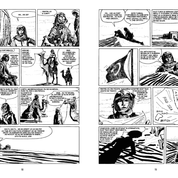 Pratt nu rateaza ocazia de a-l pomeni pe legendarul scriitor, diplomat si comandant militar britanic T. E. Lawrence, tinandu-l insa in culisele povestii (aflam ca momentan se afla mai in nord, aproape de Damasc) si pune in gura lui „El Oxford” o replica din veneratul film regizat de David Lean in 1962, Lawrence of Arabia: „Prefer desertul […] pentru ca e curat.” Din Lawrence-land, Corto si Cush trec in Somalia, pe pamant rimbaldian – detinut insa de englezi – pentru Lovitura de gratie, care e povestea unei rebeliuni anticoloniale. Pentru cea de-a treia povestire, … Despre alti Romeo si alte Juliete, Corto si Cush merg in Etiopia, unde viziteaza satul natal al lui Cush si se implica intr-un conflict religios (musulmani contra crestini). Cat despre povestirea finala, Leoparzi, aceasta e plasata in Africa orientala, care in octombrie 1918 este inca germana, generalul Lettow-Vorbeck creandu-le dificultati britanicilor.