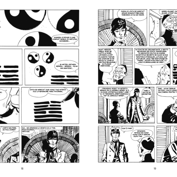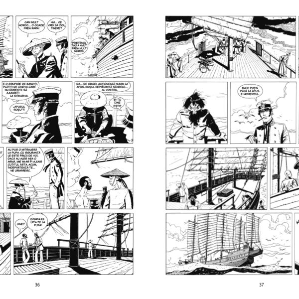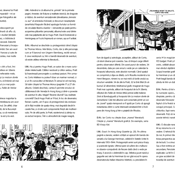 I.M.: Nu si pentru Hugo Pratt, un autor de o mare curiozitate intelectuala. Calator neobosit si cititor asiduu, Pratt isi inzestreaza personajele cu aceleasi pasiuni. Prin urmare, Corto Maltese nu putea fi doar un marinar nomad, ci si un fin cunoscator al literaturii. In sensul ei cel mai larg. Sa luam Utopia lui Thomas Morus (paginile 17 si 27 din album). Odata deschisa, cartea ii permite eroului sa calatoreasca din Venetia in Hong Kong si dintr-o poveste de aventuri in alta. Magie? Reverie diurna? Sau realitate concreta?”