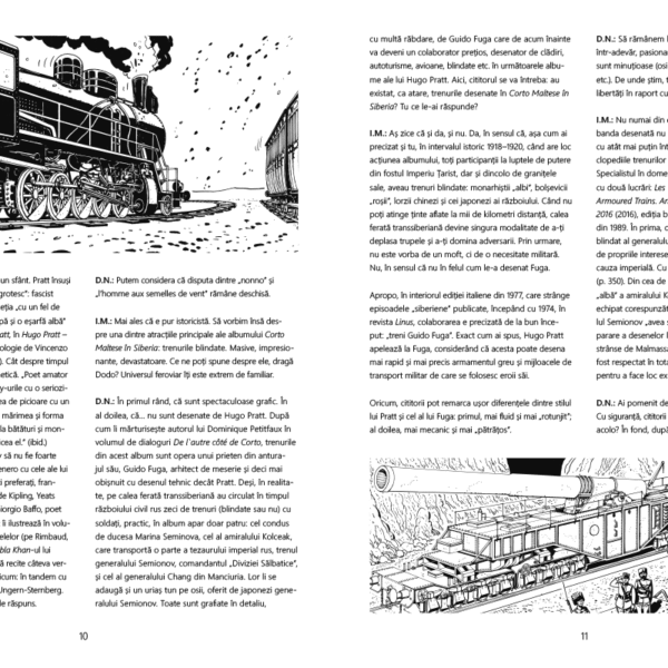 D.N.: Aventurile lui Corto Maltese au fost publicate in revista Pif Gadget, in serial, intre 1970 si 1974. Eu sunt nascut in 1964 si am tinut in mana primele Vaillant si Pif Gadget abia prin 1975–1976, de la colegi de scoala. Imi amintesc ca nu prea mi-au placut rarele episoade cu Corto pe care le-am gasit acolo. Inainte de orice, nu le intelegeam, mi se pareau prea filozofice si, la acea varsta, nici nu stapaneam limba franceza asa de bine (in scoala mea, limba franceza se invata din clasa a V-a). Apoi, desenul lui Pratt era prea schematic, prea epurat, incomparabil – mi se parea mie atunci – cu desenele aproape fotografice ale lui Cheret (Rahan) sau Marcello (Doc Justice). Abia pe la mijlocul anilor ’80 l-am redescoperit pe Hugo Pratt, avand o sansa extraordinara sa aflu ca, la Universitatea din Craiova, unde am studiat Stiintele Economice, exista un lectorat francez, o biblioteca formidabila cu mii de carti in limba franceza. Datorita revistei Pif Gadget, prinsesem gustul francezei si incepusem sa citesc si literatura in aceasta limba. Dar am avut uriasa bucurie sa gasesc la lectoratul francez si sute de albume de benzi desenate. Printre acestea, mai multe din seria Corto Maltese. Primul album din serie pe care l-am citit a fost, imi amintesc foarte bine, chiar Corto Maltese en Siberie. Pana astazi, el ramane unul dintre preferatele mele, alaturi de La balade de la mer salée si La maison dorée de Samarkand. De ce? Probabil pentru ca imbina cel mai bine aventura cu istoria si romantismul si e mai putin filozofic si abscons decat, de exemplu, Fable de Venise sau Les Helvetiques. Si apoi, in acest album, actiunea se petrece majoritar la bordul unor trenuri blindate. Iar eu dintotdeauna am avut o… slabiciune fata de calatoriile cu trenul. De altfel, chiar am calatorit foarte mult pe calea ferata, de la Bucuresti la Moscova si de la Craiova la Lisabona, ca sa mentionez doar destinatiile cele mai indepartate, la est si la vest.