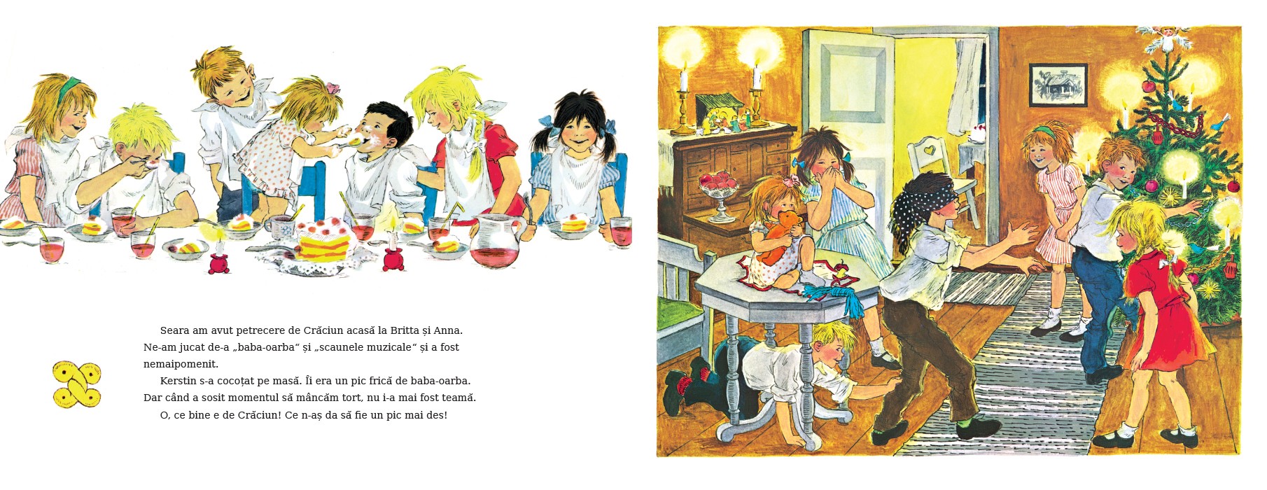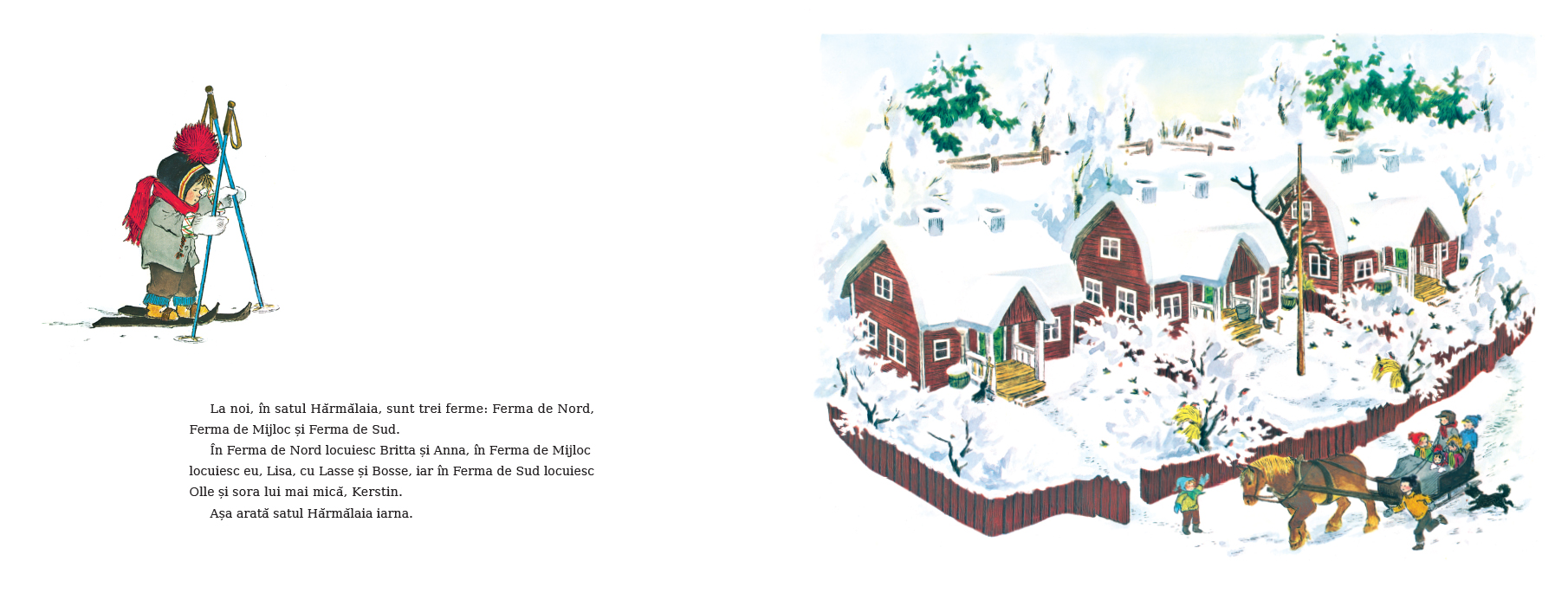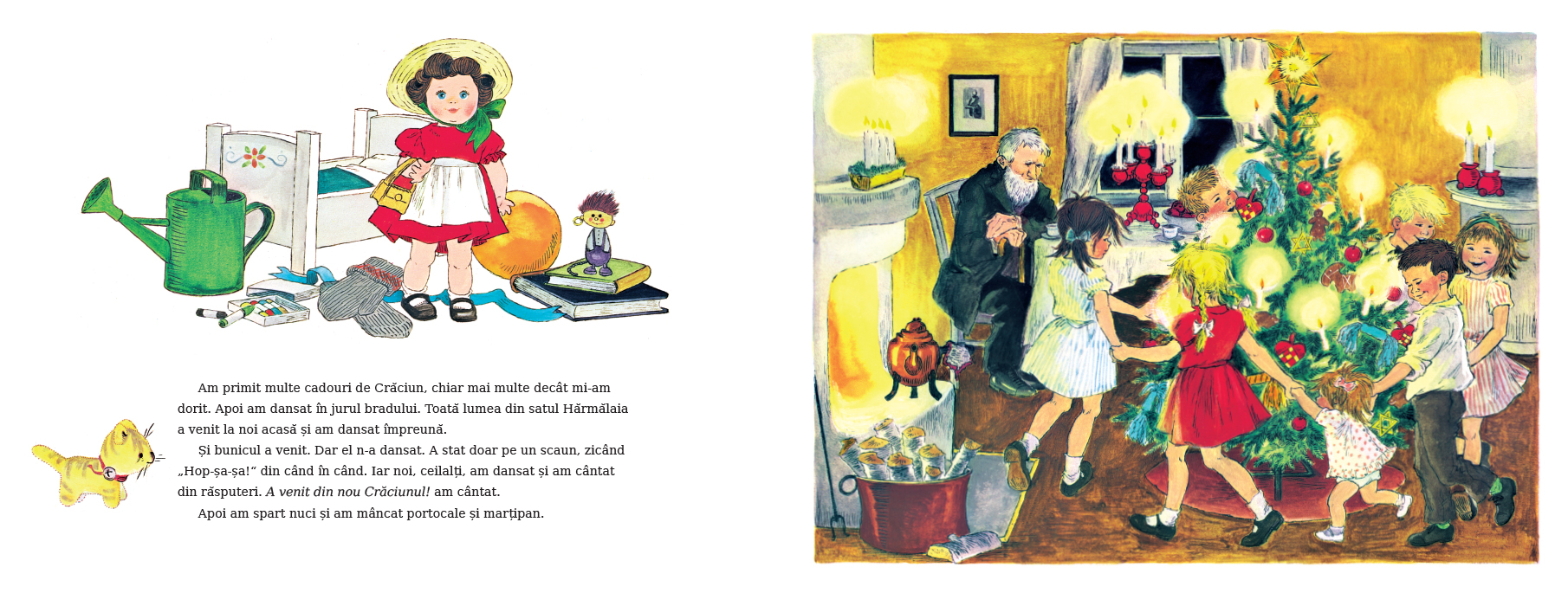 De Craciun e veselie mare la noi, in Harmalaia. Pana si vrabiilor le e bine atunci, fiindca le punem snopi de ovaz uscat sa se ospateze. Grauntele sunt si pentru botgrosi, si pentru alte pasarele flamande. Si noua, copiilor, ne e bine de Craciun, ba chiar mai bine decat vrabiilor. Hai sa va povestesc cum a fost anul trecut de Craciun. Cu trei zile inainte, am facut turta dulce. Si ne-am distrat aproape la fel de mult ca in seara de Ajun. Aroma de turta dulce a cuprins tot satul. O, ce bine e de Craciun! Ce n-as da sa fie un pic mai des!