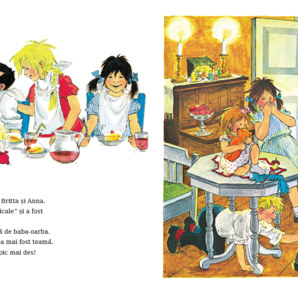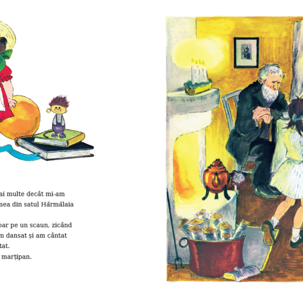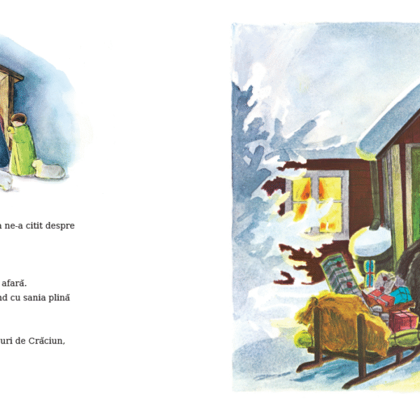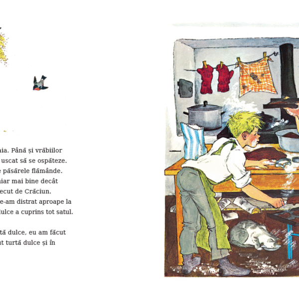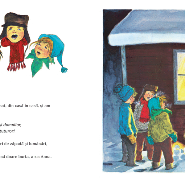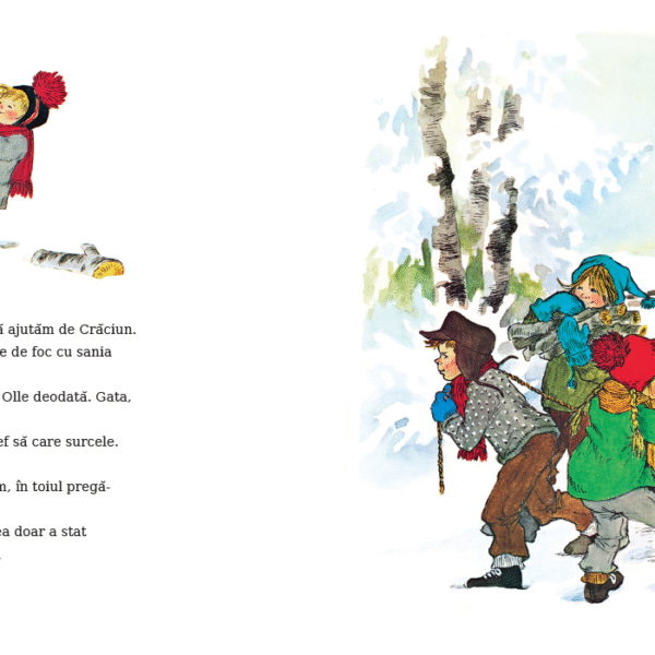 De Craciun e veselie mare la noi, in Harmalaia. Pana si vrabiilor le e bine atunci, fiindca le punem snopi de ovaz uscat sa se ospateze. Grauntele sunt si pentru botgrosi, si pentru alte pasarele flamande. Si noua, copiilor, ne e bine de Craciun, ba chiar mai bine decat vrabiilor. Hai sa va povestesc cum a fost anul trecut de Craciun. Cu trei zile inainte, am facut turta dulce. Si ne-am distrat aproape la fel de mult ca in seara de Ajun. Aroma de turta dulce a cuprins tot satul. O, ce bine e de Craciun! Ce n-as da sa fie un pic mai des!