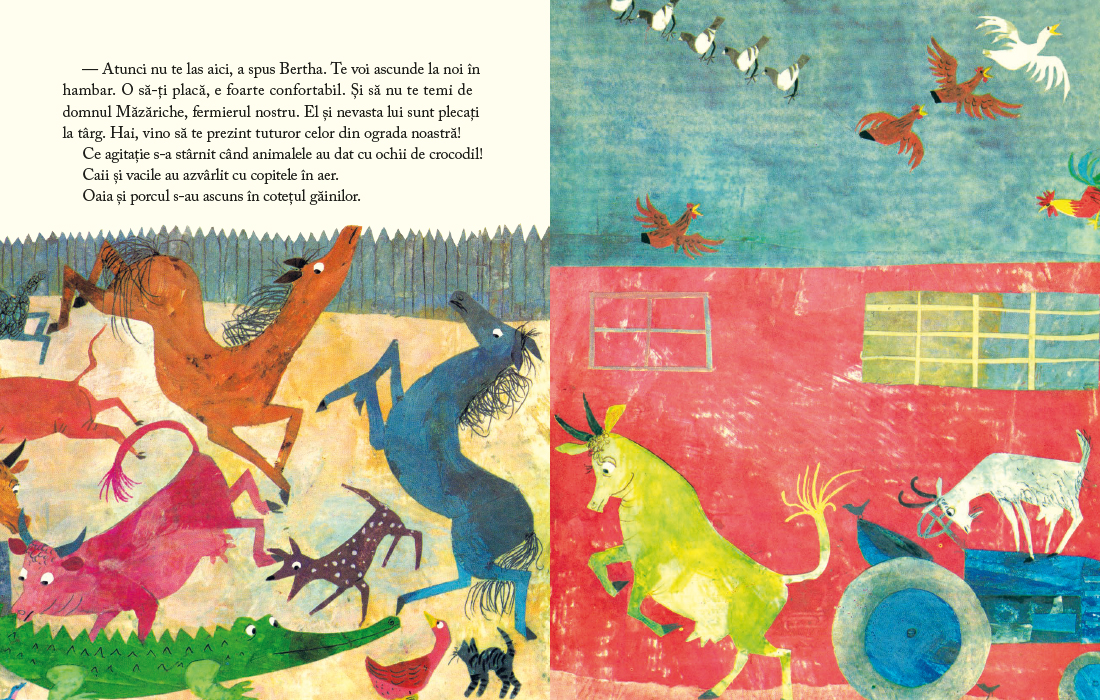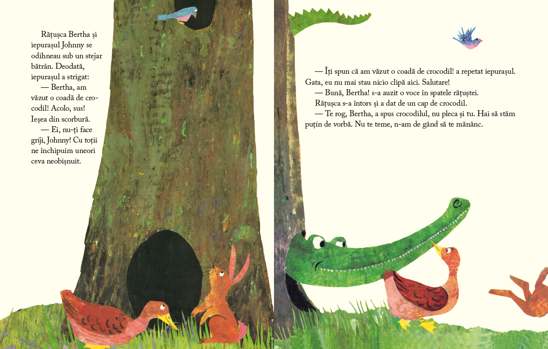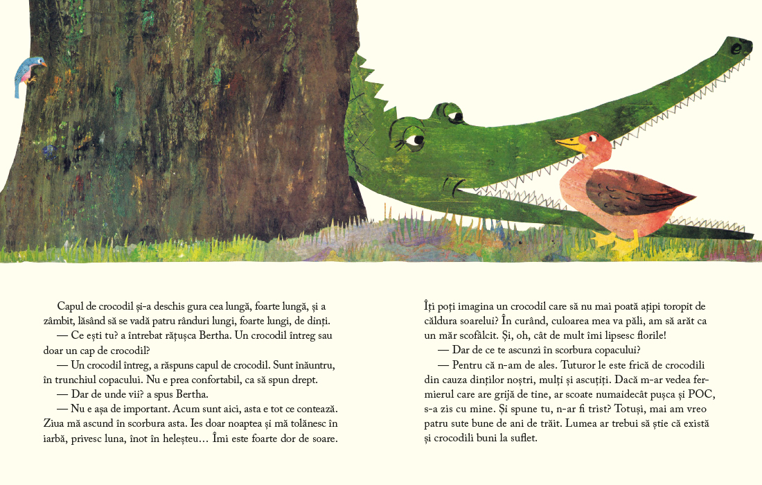 Crocodilii sunt mari, fiorosi, au gheare si o multime de dinti ascutiti. Nu vor decat sa te inhate, stie toata lumea. Cel putin asa crede un iepuras cand descopera un crocodil ascuns in scorbura unui copac. Iepurasul nu sta deloc pe ganduri, de crocodil fugi, e simplu. Poti sa-l crezi cand te roaga frumos sa stai, sa vorbiti de una-alta si poate chiar sa fiti prieteni?