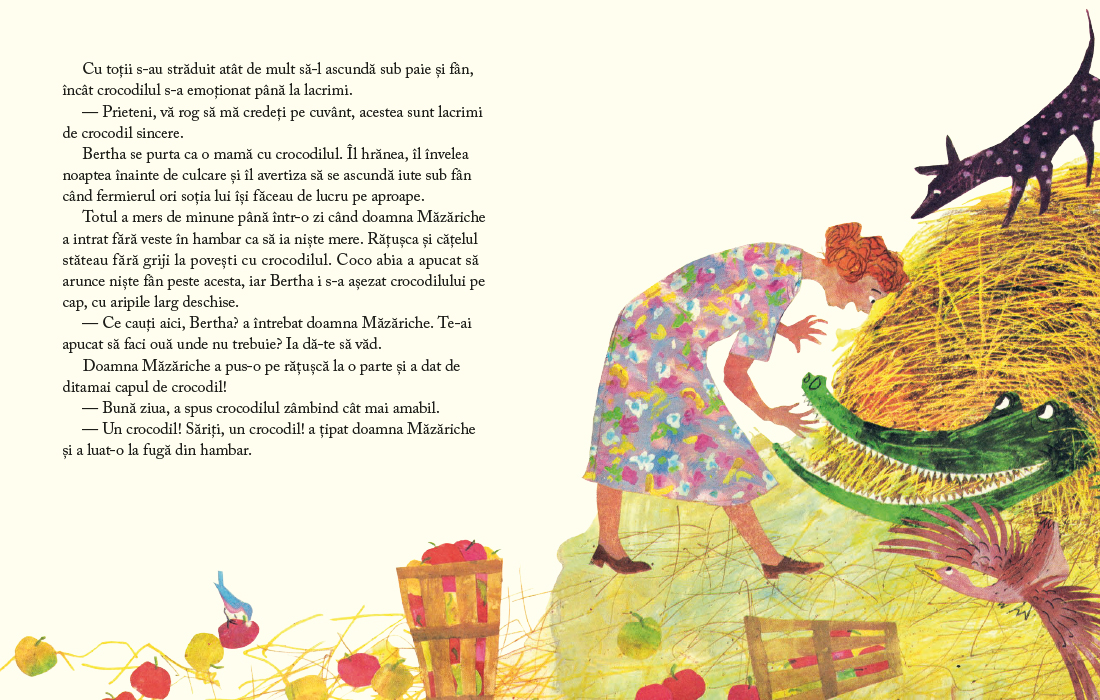 Dar o ratusca oarecare are curajul sa-si invinga teama si sa stea de vorba cu crocodilul. Daca esti curios sa cunosti pe cineva, cum s-o faci daca fugi de el? Crocodilul se dovedeste nu numai prietenos, ci si pasionat de flori si priceput la gradinarit, ceea ce-l face sa-si gaseasca un rost printre locuitorii fermei unde traieste ratusca.