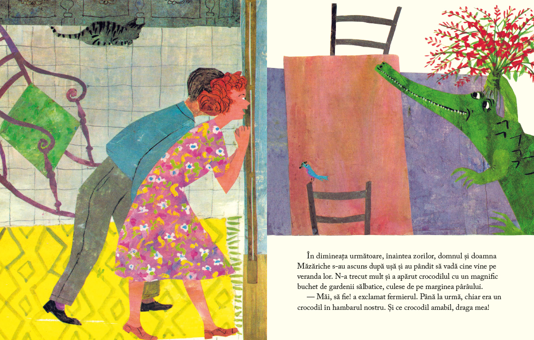 Povestea lui Roger Duvoisin are subtilitatea de a nu idealiza: nici in text, nici in ilustratii, dintii teribili ai crocodilului nu sunt ascunsi. Cu alte cuvinte, e firesc sa ne fie teama de necunoscut, iar prejudecatile au uneori rostul lor, ne apara de pericole reale. Dar cand incercam sa le depasim, avem sansa sa ne facem prieteni buni, sa cunoastem diversitatea lumii si sa ne gasim drumul in viata.