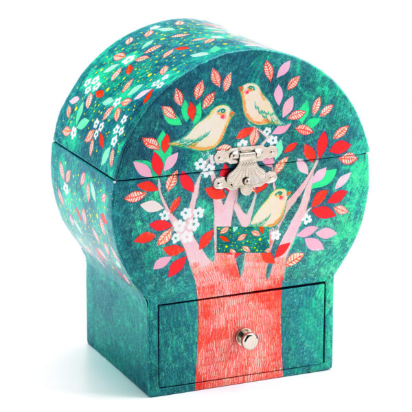 Cutie muzicala Copac este un accesoriu minunat pentru camera copilului tau! Cu o silueta de copac, aceasta cutie muzicala are un sertar special pentru a pastra bijuterii si lucruri secrete. Intoarce cheita, deschide cutia si lasa-te surprins! O figurină frumoasă, sculptată cu delicatețe, se rotește, reflectată într-o oglindă. Melodia „Santa Lucia” durează aproximativ 2 minute și 30 de secunde.
