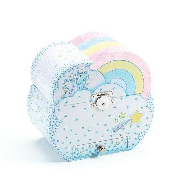 Cutie muzicala Visul unicornului este o cutie muzicală în formă de nor, căptușită cu catifea, cu un sertar pentru a păstra bijuterii și lucruri secrete. Întoarce cheița, deschide cutia și lasă-te surprins! Un unicorn delicat se retoște, reflectat într-o oglindă în formă de nor. Melodia „Dunărea Albastră” de Johann Strauss, durează aproximativ 2 minute și 30 de secunde.