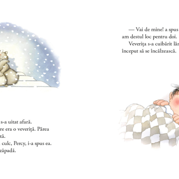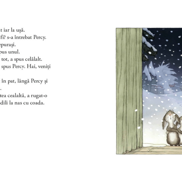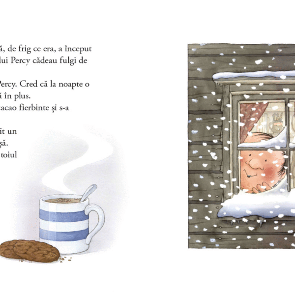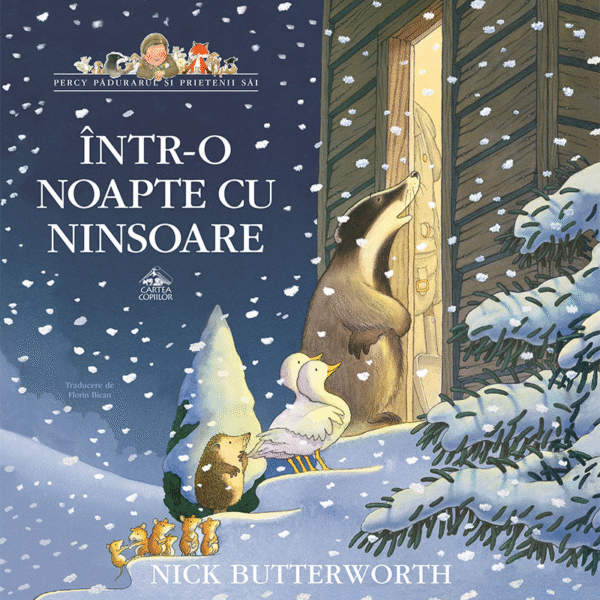 „Intr-o noapte cu ninsoare“ este prima carte din seria „Percy Padurarul si prietenii sai“, iar editia de fata este una de sarbatoare, in format mare, generos, cu coperta cartonata lucioasa si interior pe hartie cretata, plus un poster 60×60 cm care-i invita pe copii la un mic joc: pot sa gaseasca in ilustratii cateva obiecte de-ale bunului padurar Percy?
