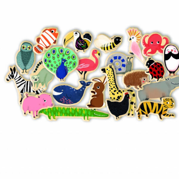 Conținut: 36 animale magnetice din lemn. Vârsta recomandată: +2 ani. Confecționat din lemn cu vopsele non toxice certificate FSC®.