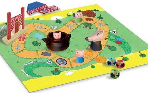 Conținut: tablă de joc, figurine (3 purceluși și un lup mare și rău), ceaun din plastic, casă de cărămidă (de construit) și 3 zaruri de lemn.