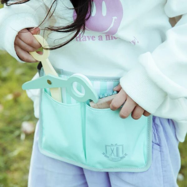 Joc de rol La coafor Set de coafură din lemn pentru copii cu 18 piese care sunt nelipsite din orice salon de coafură și frizerie. Conține: centură reglabilă pentru echipamente de frizerie, husă de protecție, foarfecă, placă pentru îndreptarea părului, oglindă, pieptene, uscător de păr etc.