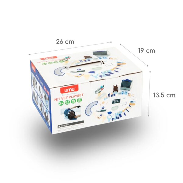 Joc de rol La medicul veterinar albastru este un set captivant care include 37 de piese realiste din lemn, perfect pentru micii veterinari in devenire. Acest joc include: câine, geantă de transport, cântar, cleștișor pentru gheruțe, seringă, uscător de păr, foarfece, mâncare pentru pisici, unguent, ciocănel, dispozitiv de aspirație, guler de protecție, stetoscop, tensiometru, picături pentru ochi, medicamente, dezinfectant, sondă, termometru, jucării, oglindă bucală, răzuitor de limbă, pensete, perie/pieptene, oglindă, Raze X, tablete, fișa pacientului și spray. Acest joc nu doar că stimulează creativitatea, dar oferă și ocazia de a exersa îngrijirea veterinară profesională pentru pisica drăguță din set și alți prieteni drăgălași. Vârsta recomandată este de 3 ani și peste. Produsul este confecționat din lemn cu vopsele ecologice pe bază de apă, conform standardelor EN71&ASTM cu certificare CE. AVERTISMENT: Contraindicat copiilor sub 3 ani! Se recomandă supravegherea adultului în timpul jocului.