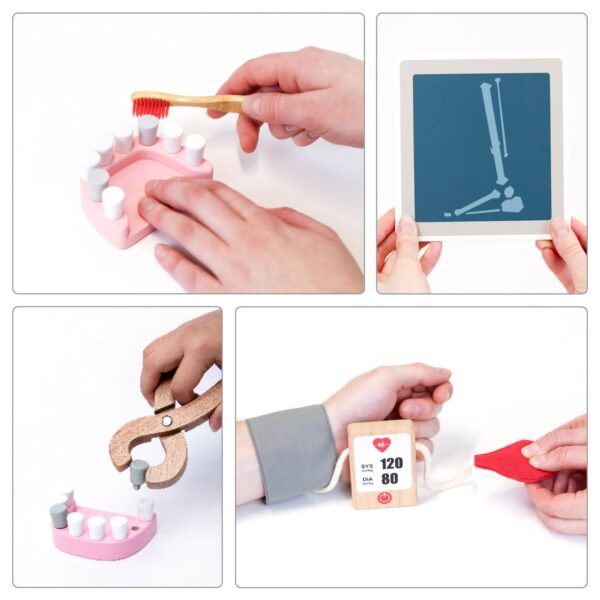 Confecționat din lemn cu vopsele ecologice, acest set este sigur pentru copii si respecta standardele EN71 & ASTM cu certificare CE. Ideal pentru copiii cu varsta de peste 3 ani, acest joc nu doar ca dezvolta creativitatea, dar si invata copiii despre importanta ingrijirii sanatatii.