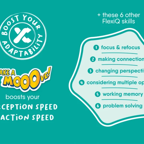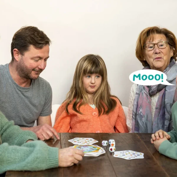 Jocul de familie Make a Mooove! de la FlexiQ aduce provocari amuzante si rapide, cu o tematica de ferma plina de viata. Copiii isi testeaza atentia si reactia folosind zaruri si carti provocare. Potrivit pentru copii de 5 ani si peste.