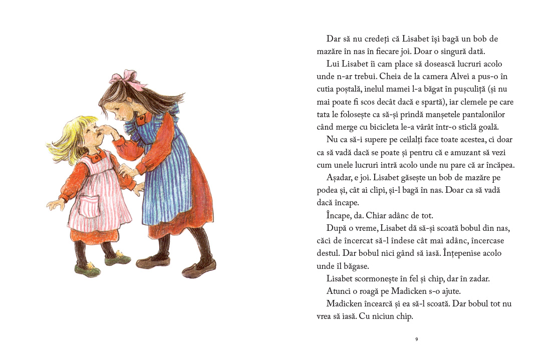 Lisabet si Madicken sunt surori. Madicken e mai mare, are mereu idei grozave de jocuri si de lucruri interesante de facut. Uneori, ce sa-i faci, ideile acestea nemaipomenite se transforma in pozne carora li se duce vestea de la un capat la altul al oraselului in care locuiesc cele doua fetite, undeva in Suedia de acum mai bine de o suta de ani. Nu e de mirare ca Lisabet o urmeaza peste tot pe sora sa si ia parte fara sa se lase rugata la toate nazbatiile, ba chiar nascoceste si ea unele noi. Cum a fost in acea zi de toamna, de pilda, cand Lisabet a vrut sa vada cat de adanc poate sa-si bage un bob de mazare in nasuc. Foarte adanc, ce interesant! Si mai interesant a fost cand bobul n-a mai vrut sa iasa, asa ca Lisabet a trebuit sa dea fuga la doctor, de mana cu sora mai mare – pentru ca Madicken nu o lasa niciodata la greu.