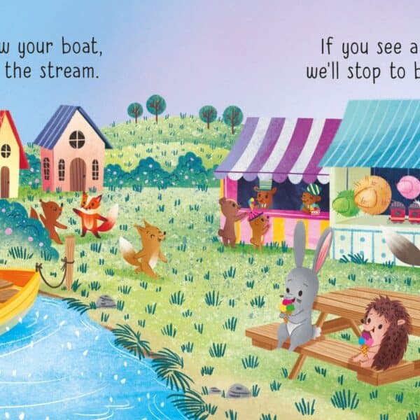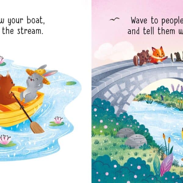 “Row, row, row your boat gently down the stream” este o carte cu versuri, dintr-un cantec popular pentru copii. Copiii se pot bucura de versurile acestei melodii clasice, in timp ce parcurg ilustratiile vesele si colorate.