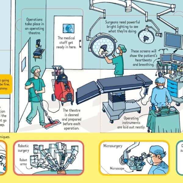 “Look Inside: A Hospital” este o carte educativa si interactiva care ofera copiilor o privire in interiorul unui spital, prezentand diferite departamente, personalul medical si procedurile uzuale. Prin ridicarea clapetelor, copiii vor invata despre rolul spitalelor in societate si importanta ingrijirii medicale.